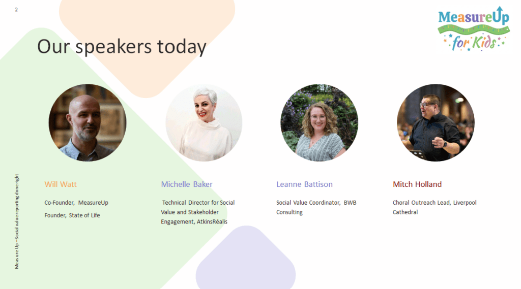 Michelle Baker (Technical Director for Social Value and Stakeholder Engagement, AtkinsRéalis) explained why AtkinsRéalis chose to sponsor this work and what drew her to MeasureUp in the first place.